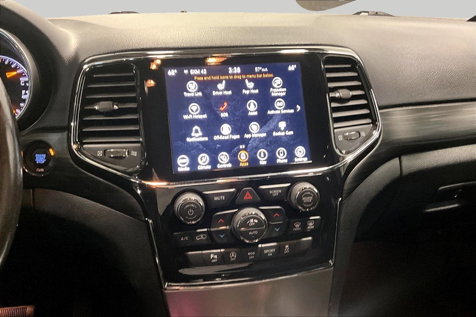 115V Auxiliary Power Outlet, 3.45 Rear Axle Ratio, 4-Wheel Disc Brakes, 6 Speakers, ABS brakes, Air Conditioning, Alloy wheels, Altitude Appearance Package, Altitude Grille, AM/FM radio: SiriusXM, Anti-whiplash front head restraints, Apple CarPlay/Android Auto, Auto-dimming Rear-View mirror, Automatic temperature control, Black Suede Seats w/Black Stitching, Body Color Claddings, Body Color Fascia, Body Color Shark Fin Antenna, Brake assist, Bumpers: body-color, Cloth Bucket Seats, Compass, Dark Day Light Opening Moldings, Dark Headlamp Bezel Finish, Dark Lens Taillamps, Delay-off headlights, Delete Laredo Badge, Driver door bin, Driver vanity mirror, Dual front impact airbags, Dual front side impact airbags, Electronic Stability Control, Emergency communication system: SiriusXM Guardian, Four wheel independent suspension, Front Accent/Body Color Fascia, Front anti-roll bar, Front Bucket Seats, Front Center Armrest w/Storage, Front dual zone A/C, Front fog lights, Front reading lights, Fully automatic headlights, Gloss Black Jeep Badging, Gloss Black Rear Fascia Applique, Heated door mirrors, Heated Front Seats, Heated Steering Wheel, Hill Descent Control, Illuminated entry, Knee airbag, Leather Shift Knob, Low tire pressure warning, Navigation System, Normal Duty Suspension, Occupant sensing airbag, Outside temperature display, Overhead airbag, Overhead console, Panic alarm, ParkView Rear Back-Up Camera, Passenger door bin, Passenger vanity mirror, Power door mirrors, Power driver seat, Power Liftgate, Power steering, Power Sunroof, Power windows, Quadra-Trac II 4WD System, Quick Order Package 2GM Laredo X (DISC), Radio data system, Radio: Uconnect 4C Nav w/8.4 Display, Rear Accent/Body Color Fascia, Rear anti-roll bar, Rear Fascia Black Molded in Color Step Pad, Rear reading lights, Rear seat center armrest, Rear window defroster, Rear window wiper, Remote keyless entry, Remote Start System, Security Alarm, Selec-Terrain System, Single Exhaust w/Bright Tip, Speed control, Speed-sensing steering, Speed-Sensitive Wipers, Split folding rear seat, Spoiler, Steering Wheel Mounted Audio Controls, Steering wheel mounted audio controls, Tachometer, Telescoping steering wheel, Tilt steering wheel, Traction control, Trip computer, Universal Garage Door Opener, Variably intermittent wipers, Wheels: 18 x 8.0 Fine Silver Aluminum, Wheels: 20 x 8.0 Gloss Black Aluminum.